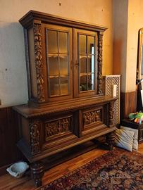 Credenza a due corpi in stile Neorinascimentale realizzata in legno noce massello scolpito. La base presenta due ante con pannelli in bassorilievo raffiguranti scene di carattere storico; l’alzata a vetri è affiancata da montanti laterali riccamente intagliati a motivi floreali.