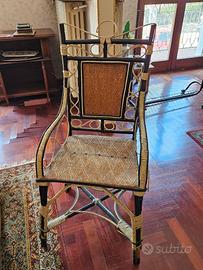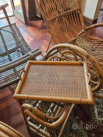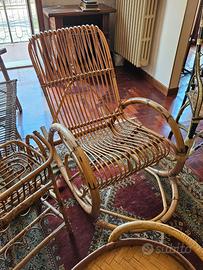 Vari mobili in vimini, sedia a dondolo, tavolini, poltrona, carrello, porta vasi, libreria