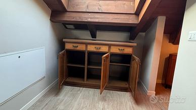 Quattro mobili vintage anni 70 in buone condizioni, costituiti da mobile a tre ante e tre cassetti, vetrinetta a due ante, mobile con un’anta e mobile con due ante, colore rovere. Smontaggio e trasporto a carico dell’acquirente