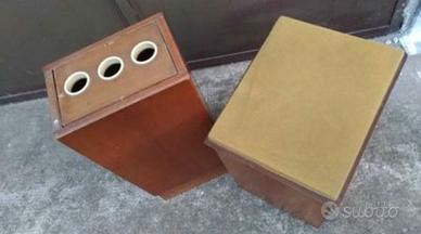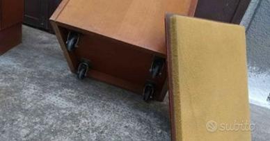 Mobiletti in legno da ingresso, stile svedese anni 1960. Dimensioni: 1) porta bastoni/porta ombrelli: larghezza 30 cm, profondità 20 cm, altezza 65 cm. 2) Sgabello per le scarpe, con ruote e coperchio removibile rivestito in stoffa: larghezza 38,5 cm, profondità 31,5, cm altezza 52 cm. Si tratta di rari pezzi di design, di ottima fattura e in buono stato di conservazione. Si possono vedere e ritirare a Montombraro, frazione di Zocca (Modena), oppure a Bologna secondo accordi. Si cedono in blocco a 45 euro.