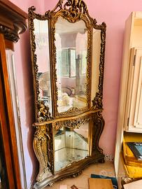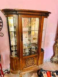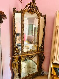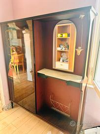 3 mobili vintage completi, ideali per arredamento classico, casa, negozio o ristrutturazione. 🔹 Composizione: * Vetrina in legno con vetri curvi (molto elegante, perfetta per esposizione) * Mobile bar anni ‘70 con specchio e appendiabiti * Console con specchiera stile barocco dorato, molto scenografica 🔹 Condizioni: * Strutturalmente sani * Necessitano di pulizia e piccoli ritocchi * Venduti come da foto Prezzo 999, 00 cadauna