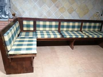 Regalo (quasi) arredamento per tavernetta costituito da panca ad elle completa di cuscini 2,80x1,30, tavolo in legno massello 0,75x2,46xh88, n 4 sedie legno con seduta in paglia, credenza 1,65x45xh 2,05. Ottimo stato.