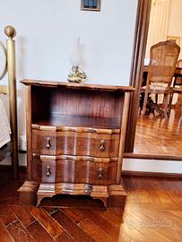 Credenza, tavolo intarsiato a mano con quattro sedie, mobile da camera con due comodini in stile Luigi XV