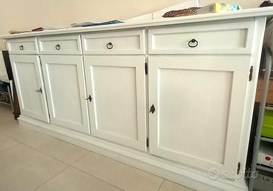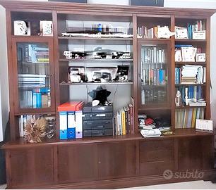 Vendesi in unico lotto o singolarmente: Parete attrezzata in legno massello, composta da una base a 5 scompartimenti (cassetti e sportelli); Una consolle porta TV con 3 cassetti ed uno sportello; Una credenza con vetrina a tre vetrate e tre sportelli ed infine una consolle sparecchiatavola a 4 sportelli e 4 cassetti (il tutto come da foto). Il prezzo dipende se si acquista singolo pezzo o unico lotto. Trasporto e smontaggio a cura dell'acquirente.