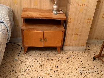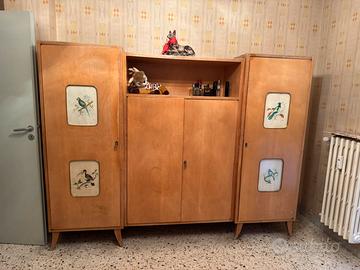 Armadio, mobile a due cassetti con anta ribalta , comidino e sedia in ciliegio anni settanta buono stato di conservazione come da foto. Decorazione con rappresentazione uccelli ad acquerello.