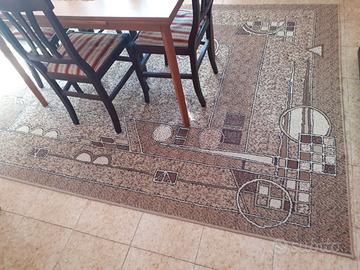 Libreria a giorno con 8 ( otto ) cassetti e lampada visibile nella foto, tavolo allungabile con quattro sedie, divano a tre posti in stoffa microfibra ( leggermente consumato ) con due Recliner ( manuali ), poltroncina singola, mobile porta tv ( in colore Wengè ) e tappeto rettangolare.