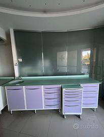 Vendesi composizione Pininfarina Saratoga + mobilio Iride completo, per studio odontoiatrico, con piano in vetro e lavello con vasca in vetro. 6 colori disponibili, in foto i vari colori (giallo, arancione, verde, blu, glicine, azzurro). Spedizione a carico dell'acquirente