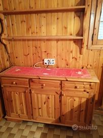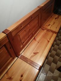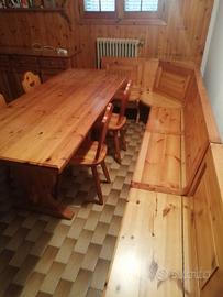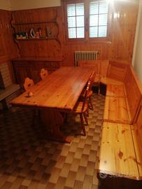 TAVOLO lunghezza 2 metri per 80 di larghezza, panca ad angolo con lunghezza totale 3,40 m mobile largo 1,40 m con cassetti completo di mensole + 4 sedie. la panca è tutta scomponibile e la seduta corta può essere montata anche nel lato destro.