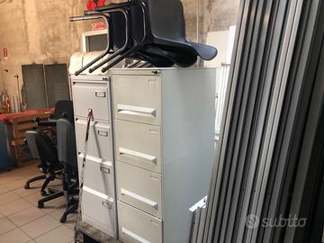 Vendesi in blocco o a singoli pezzi arredamento per ufficio di colore grigio chiaro composto da , 6 scrivanie con le sue 6 cassettiere, armadi in ferro con porte scorrevoli di tre altezze diverse oltre a diversi accessori.