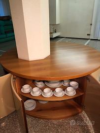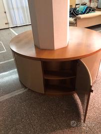Imobile in legno massiccio con ante laccate colore beige, apertura tramite insertinin pelle, e ripiani interni adatto per il contorno fi un pilastro centrale da trasformare in gorma ottoconsle von lati da 23 cm. O ppure da adattare foto centrale a forna quadrata o diversa anche tonda. Il mobile si trova smontato e quindi facilmente trasportabile la base superiore tonda ha in diametro eccentrico di 175 cm. Usato pochisdimo e perfetto.
