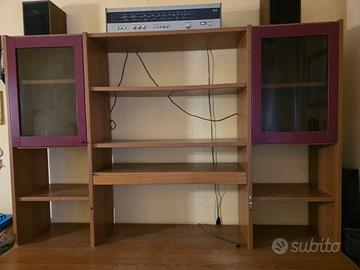 Mobile composto da piano scrivania con cassettiera e vano con sportello misure cm. 190x74x60 e alzata con due vani con sportelli a vetro misure cm. 190x126x33 (radio non compresa). Buone condizioni, completamente smontato, prelievo e trasporto a carico e cura acquirente.