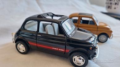 Due modellini fiat 500 in metallo. Si aprono le portiere come da foto. In quella nera si ribaltano i sedili ed è in scala 1/24.