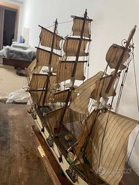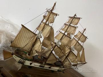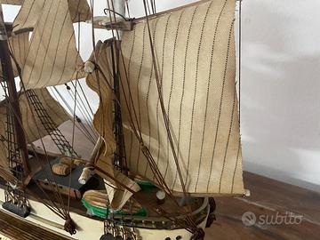 Il modello è in buone condizioni vintage. Ci sono alcune crepe nella verniciatura e il legno sembra un po' secco, presenta alcune rotture sui supporti in legno delle vele (vedi foto), ma tutti questi problemi possono essere riparati se decidi di restaurarla.