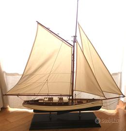 Oggetto “usato” (anche se usato non è trattandosi di un modellino) ma in ottimo stato e senza alcun danno poiché tenuto in vetrina. Scafo: lunghezza cm 61, larghezza cm 15, altezza senza deriva cm 10. Scafo con timone e albero manovre fisse: lunghezza cm 92. Altezza albero dal punto di ancoraggio: cm 75. Altezza complessiva con base, misurata dalla base alla punta dell’albero: cm 92. Misura della base: lunghezza cm 52,5 – larghezza cm 17,5 – altezza cm 5,7.