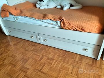 Vendo causa trasloco imminente blocco con letto a castello e relative doghe 190x80 cm (letto superiore dotato di dispositivo inclinabile per maggior confort nel riordino); armadio superiore a sinistra; libreria con scaffalatura in basso a destra; due comodi cassetti sotto il letto; mensolina di appoggio; luci led verticali per entrambi i letti; scaletta di accesso rimovibile; pannello di protezione letto superiore.