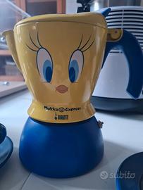 Moka Bialetti Mukka express edizione speciale Tweety per la produzione di cappuccio e latte macchiato direttamente sul fornello. Completa di due tazze con piattino.