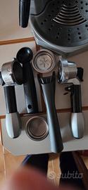 macchina per espresso colore argento accessoriata. Due tazze. tre modalità diverse: cialde, capsule, caffè macinato. beccuccio per cappuccino.