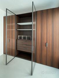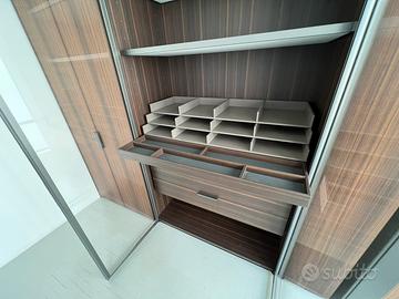 Armadio Gliss master della Molteni, misura 330 di larghezza, 260 di altezza e 60 di profondità. Due vani con appendi abiti doppie, un vano centrale con ripiani in vetro illuminati e blocco cassetti con porta camicie e gioie/cravatte. Rifinito in legno Eucalpito, con ante in vetro e maniglie in bronzo. L’armadio e in perfetto stato. Ha solo un piccolissimo difetto in alto sul lato destro: la finiture in eucalpito si è alzata di 2 mm, per una lunghezza di 7 cm. Praticamente invisibile e probabilmente aggiustabile. Questo modello è ancora in produzione, percio possibile aggiungere altri elementi identici. Prezzo nuovo oltre 12.000 euro Vendo perche non entra nella nuova casa, attualmente l’armadio è smontato ed è ancora imballato dal traslocatore. Da ritirare a Civenna (provincia di Como). Non accessto proposte al di fuori di Subito, non condivido numero di telefono.