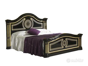 Testiera e Pediera Imponenti: il letto matrimoniale è il protagonista assoluto, con una testiera elegantemente sagomata e impreziosita da un grande medaglione centrale e motivi a greca in finitura oro, che richiamano lo stile classico.