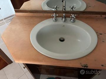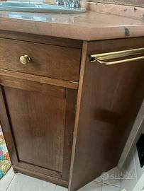 Mibile realizzato da artigiano, particolare designe , anta inclinata con apertura a vasistas , con intersio ( realizzato come il mobile interamente a mano) , dotato di porta asciugamani in entrambi i lati. Piano in marmo rosa , lavello ceramiche ideal standard. Rubinetteria in acciaio