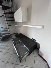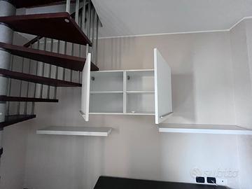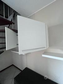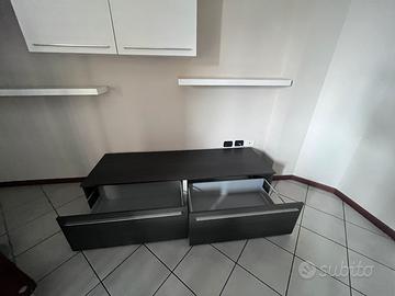 Composizione mobili soggiorno così composta: pensile ante bianca rovere sbiancato con misure larghezza 120 cm, altezza 60 cm e profondità 35 cm. Mensole bianche nr. 2 di larghezza 110 cm, profondità 26 cm e spessore 5 cm. Mobile terra in rovere grigio antracite con due cassetti con misure 180 cm larghezza, 58,5 cm profondità e 40 cm altezza. Smontaggio e trasporto a cura di chi compra. I mobili sono a Legnano.