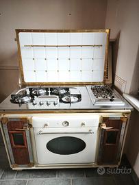 Vendo blocco cottura 4 fuochi con accensione automatica, griglia elettrica e forno ventilato perfettamente finzionante da L.120cmxP.65/70xH.83 e Cappa filtrante L.130cmxP.32/50xH.220. Parete piastrellata con barra porta mestoli L.111cmxH.66 Marchio Marchi Cucine in legno massello colore panna con inserti dorati. RITIRO A DOMICILIO