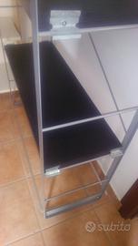 Scaffale libreria con 3 ripiani in truciolare color wengè 30x91, spalle laterali in metallo satinato 173. Modello Ikea Omnes non più in assortimento. I ganci per l'appoggio dei ripiani sono stati sostituiti come da foto in quanto quelli originali erano in plastica, meno robusti.