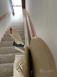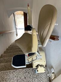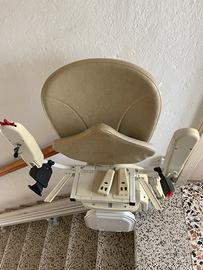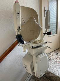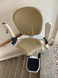 Montascale Senior Life, lunghezza 5 metri e 40 centimetri, con cremaliera modificabile, dotato di poltroncina girevole con copri poltroncina (nuovi), pedana poggia piedi, 2 telecomandi, cintura di sicurezza, sensori di sicurezza, chiave, display diagnostico, comando di direzione, punti di ricarica, libretto delle istruzioni