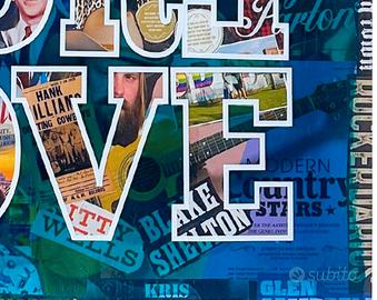 Questo nuovo pezzo di pop art intitolato "MORE LOVE" è un vibrante tributo alla musica country e alle sue star iconiche, combinando elementi nostalgici con un'estetica moderna ispirata al pop. La frase "MORE LOVE" è incorporata in un collage di famosi musicisti country, copertine di album e immagini classiche del mondo della musica country. Con artisti leggendari come Johnny Cash, Dolly Parton, Willie Nelson, Kenny Rogers e molti altri, l'opera d'arte cattura l'essenza e la ricca storia della musica country.