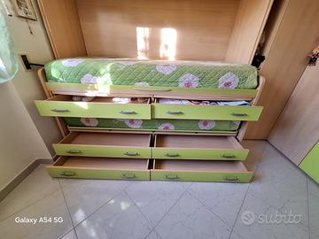 Elemento Moretti Compact composto da due letti, due scrittoi estraibili, quattro cassetti. Letto sottostante dotato di rotelle per lo spostamento scorrevole in entrata in uscita. Smontaggio e ritiro a carico dell’acquirente.