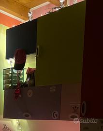 Tre letti di cui uno a soppalco, uno a scomparsa e l’altro con le ruote che si può spostare. Ideale per bambini e bambine. Scalini con scomparti ad antine. Doppio baule comodissimo per riporre cambio stagione e piumoni. Colori: azzurro/ verde chiaro e lilla, parti in legno color larice. Modulo libreria con ante, quattro scomparti. Sempre colori azzurro/ verde chiaro/ lilla. Tenuta benissimo.
