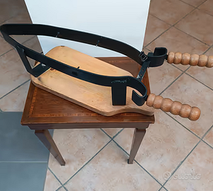 Bella morsa per taglio del prosciutto al coltello. Ben tenuta, funzionale, base in legno.