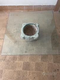 Mortaio antico in pietra con base superiore con vetro di cristallo