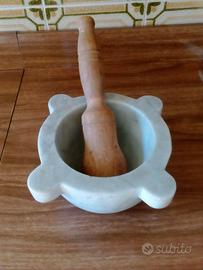Mortaio bianco in marmo di ottima qualità con pietra naturale di Carrara e lavorazione artigianale italiana, da cucina con pestello in legno di faggio per preparare pesto, schiacciare noci. pinoli, nocciole, etc,