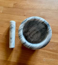 Elegante mortaio in marmo con venature naturali nei toni del grigio e del bianco, completo del suo pestello coordinato. Un oggetto che unisce la funzionalità in cucina (ideale per pesti, spezie ed erbe aromatiche) a un design classico che lo rende perfetto anche come elemento d'arredo.