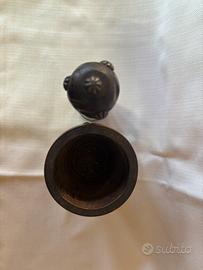 Robusto mortaio in legno completo di pestello, ideale per tritare spezie, erbe aromatiche, aglio e preparazioni tradizionali. Struttura solida, lavorazione artigianale e dettagli decorativi che lo rendono anche un bell’oggetto da cucina. Perfetto sia per uso quotidiano che come elemento rustico d’arredo.