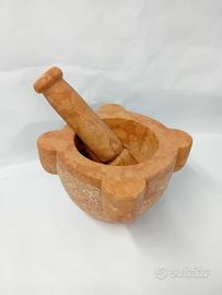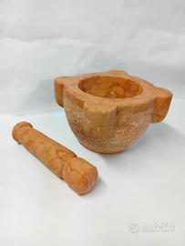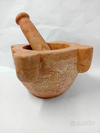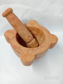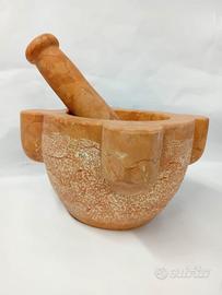 SALVE, MI CHIAMO CIRO, PROPONGO UN MORTAIO IN MARMO ROSSO VERONA CON PESTELLO IN MARMO SEMPRE DI ROSSO VERONA. IDEALE DA USARE PER FARE IL PESTO O MEDICINALI, DA USARE ANCHE COME SOPRAMMOBILE. DIAMETRO CM. 23, DIAMETRO INTERNO CM. 16, PROFONDITA' CM. 10, ALTEZZA CM. 16. LA PARTE ESTERNA E' LEGGERMENTE BOCCIARDATO. IL PESTELLO MISURA CM. 25, CON UN DIAMETRO DI CIRCA CM. 6. SONO A DISPOSIZIONE PER INFORMAZIONI. Il marmo rosso di Verona è un calcare nodulare che, per quanto riguarda la classificazione dei materiali lapidei, rientra nel gruppo dei calcari lucidabili. Presenta al suo interno scheletri fossili di ammoniti e rostri di belemniti immersi in una matrice microsparitica formata da fecal pellets. Può essere estratto dalla formazione del Rosso Ammonitico Veronese o della Scaglia rossa, entrambi affioranti ed estratti nei Monti Lessini. RICETTA PER IL PESTO: Ingredienti 50 gr di foglie di basilico fresco 1 spicchio d’aglio 15 gr di pinoli 70 gr di parmigiano reggiano 30 gr pecorino sardo 100 ml di olio extravergine d’oliva un pizzico di sale grosso. Preparazione nel mortaio 1. Lavate ed asciugate bene le foglie di basilico. 2. Nel mortaio mettete i pinoli, l’aglio finemente tagliato e iniziate a pestare fino a ridurli quasi in crema. 3. Poi un po’ alla volta aggiungete le foglie di basilico con un pizzico di sale grosso continuando a pestare contro i bordi del mortaio e con un movimento rotatorio fino ad ottenere un composto omogeneo. 4. Infine versate il trito in una ciotola aggiungendo il parmigiano reggiano grattugiato e l’olio extravergine d’oliva mescolando bene. 5. Per condire la pasta, si consiglia di diluire il pesto con qualche cucchiaio di acqua di cottura ancora ben calda e naturalmente servite il piatto cospargendolo con parmigiano reggiano grattugiato.