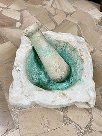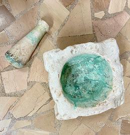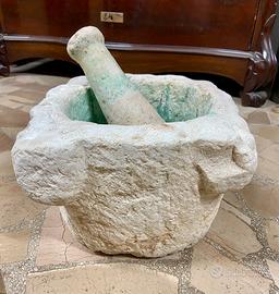Robusto mortaio artigianale in pietra naturale, completo di pestello abbinato, ideale per chi cerca un pezzo autentico, funzionale e di grande impatto visivo.