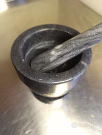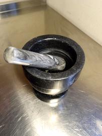 Mortaio in marmo nero con pestello in marmo, made in Taiwan. Altezza 10 cm, diametro interno 7cm, spessore bordo 1,5 cm. Peso 1,3 kg.