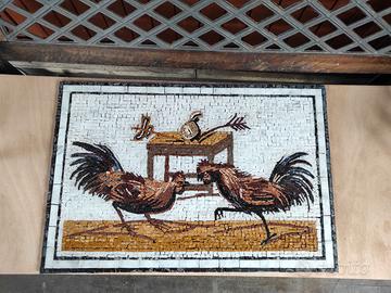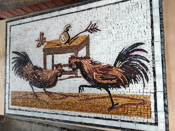 mosaico "combattimento di galli" realizzato interamente a mano con tessere (tagliate con martellina e tagliolo a mano) di marmi di varia raffinatezza.Posato su rete di fibra ( non cementato)