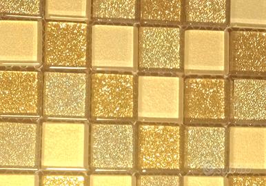 MOSAICO IN VETRO GLITTERATO ORO MIX FOGLIO MISURA 30X30 CM TESSERA MISURA 2,3X2,3 CM SPESSORE MISURA 5 MM PUO ESERE TAGLIATO A FASCIE E UTTILIZATO COME GRECA DECORATIVA TAGLIANDO AD ALTEZZA DI DUE TESSERE SI OTTIENE 1,80 ML CODICE ARTICOLO 233G PRODOTTO "VITREX" DISPONIBILITA' 8 FOGLI PREZZO AL FOGLIO 5 EURO