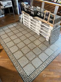 Tappeto ornamentale in mosaico da 3 × 2,4 m in marmo naturale lavorato artigianalmente negli anni 70. Ne sono stati prodotti circa 7/8 esemplari di cui sono stati venduti due a Milano uno in Svizzera uno in America e due in Libia per due generali funzionari di Gheddafi. Questo era uno che avevamo sempre tenuto in visione a secco e poi nel 1990 è stato posato qui come campione ornamentale presso la nostra sala mostra di Castellanza via Saronno 24. Ora, siccome dobbiamo ristrutturare la sala mostra, dovrà essere rimosso, non ricordiamo bene come era stato posato al tempo, in quanto in genere mettevamo sopra al massetto un divisorio in carta catramata, quindi se fosse così verrebbe su a falde e quindi recuperabile. Se qualcuno fosse interessato potrebbe venire qui a visionarla e fare un accordo che soddisfi entrambe le parti.