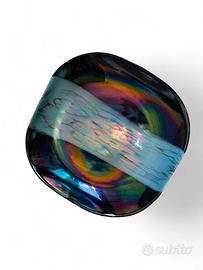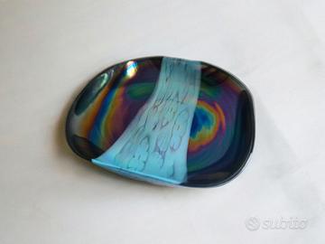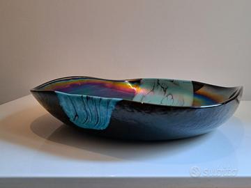 La superficie è caratterizzata da un contrasto cromatico molto suggestivo: una base di colore nero iridescente, è attraversata, centralmente, da una larga striscia decorativa di colore azzurro. Quest'ultima sembra quasi fluttuare sulla superficie nera, creando un effetto di profondità e movimento.