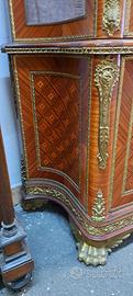 Abbiamo di fronte una vetrina doppio corpo stile Impero , con piedi a zampe di leone in bronzo , tutta legno massello, placche con dipinti , serie di inserti in bronzo , una vetrina di alto artigianato italiano , proveniente da una villa molto lussuosa. Acquistata negli anni 80 presso il famoso mobilificio di Consonni