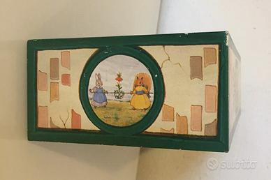 DESCRIZIONE: Scatola portagioie con carillon, musical box, funzionante, illustrato da Margaret Tempest basato sulla favola per bambini "Little Grey Rabbit". Aprendo il cassetto inferiore parte la musica (Chim Chim Cher-ee dal film Disney Mary Poppins, Cam-caminì, cam-caminì, spazzacamin) e la coniglietta inizia a ballare. Carica a manovella. I disegni ricordano quelli di Beatrix Potter.