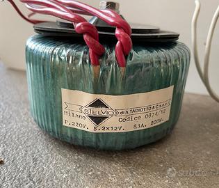 N. 1 trasformatore toroidale e n. 3 faretti alogeni. Trasformatore toroidale della ditta Stelvio – Milano - codice 0874/12. P.220 V.- s.2x12V. - 8,3 A – 200 W. Il trasformatore toroidale altamente efficiente grazie ai componenti con cui è costruito. L'avvolgimento del rame è effettuato in modo uniforme e compatto per mantenere livelli di rumorosità pressoché nulli. Lo spazio ridotto è dovuto al sistema di costruzione toroidale che riduce notevolmente lo spazio rispetto ad un trasformatore lamellare tradizionale. - Dimensioni: Diametro 100mm x H 55mm - Peso: gr. 1800 – trasformatore Fornito con supporto di montaggio metallico con perno e dado in acciaio e gomma isolante. Faretti orientabili della ditta Reggiani di Sovico – Italia - Apparecchio orientabile da incasso, per lampade alogene – mod. n- 3702 - con riflettore dicroico a bassa tensione. Colore oro. In buone condizioni. - Dimensioni: mm. 100X100 placca esterna – diam. mm.90 - Peso: gr. 540 – n.3 faretti Per una migliore valutazione del lotto offerto verificare le foto allegate. Le foto sono parte integrante della descrizione L’ oggetto sarà accuratamente imballato e spedito con pacco tracciabile.