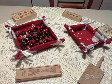N 2 cestini di Natale in cotone stampato fantasia natalizia. Colore rosso borgogna con stampe bianche e grigio perla di cuori e stelle e fiocchetti di raso bianco. Misure cm 20 per cm 20 e cm 16 per cm 12. Belli e utili perla tavola di Natale. In regalo due presine della stessa fantasia.