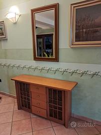 Vendo a Ostiglia MN 2 composizioni di mobili per soggiorno in condizioni eccellenti, marca MOLTENI e realizzate in legno massello finitura colore ciliegio e verde pastello: (1) mobile a parete con colonne in legno e a vetri e mobile porta TV con cassetti e vano bar porta bottiglie, dimensioni parte colonne in cm L 205 x P 33 x H 230, porta televisore L 145 x P 58 x H 50 (2) mobile divisorio in legno con vano porta abiti e mensole in legno ed in vetro, dimensioni in cm L 205 x H max 230 x P 33. Comprende console di ingresso dimensioni cm larghezza 130 x altezza 73 x profondità 37 con specchio cm 98 x 60. Costo totale 490 €, smontaggio e trasporto a carico acquirente, acconto in fase di accordo dopo sopralluogo e importo rimanente prima di iniziare lo smontaggio