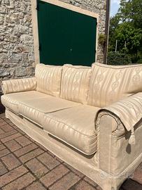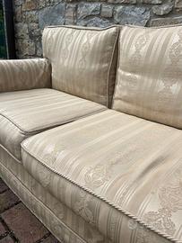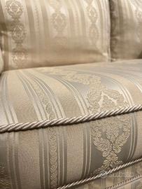 Vendo coppia di divani in stile classico, uno a 2 posti e uno a 3 posti, entrambi rivestiti in tessuto damascato beige con decorazioni tono su tono e finiture in cordoncino.
