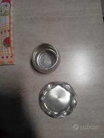 N.2 oggetti da arredamento lucenti. Un piattino sagomato diametro cm.10 e un contenitore bombato diametro 6 cm. altezza 6 cm. In materiale lucente "inalterabile" (marchio sotto).